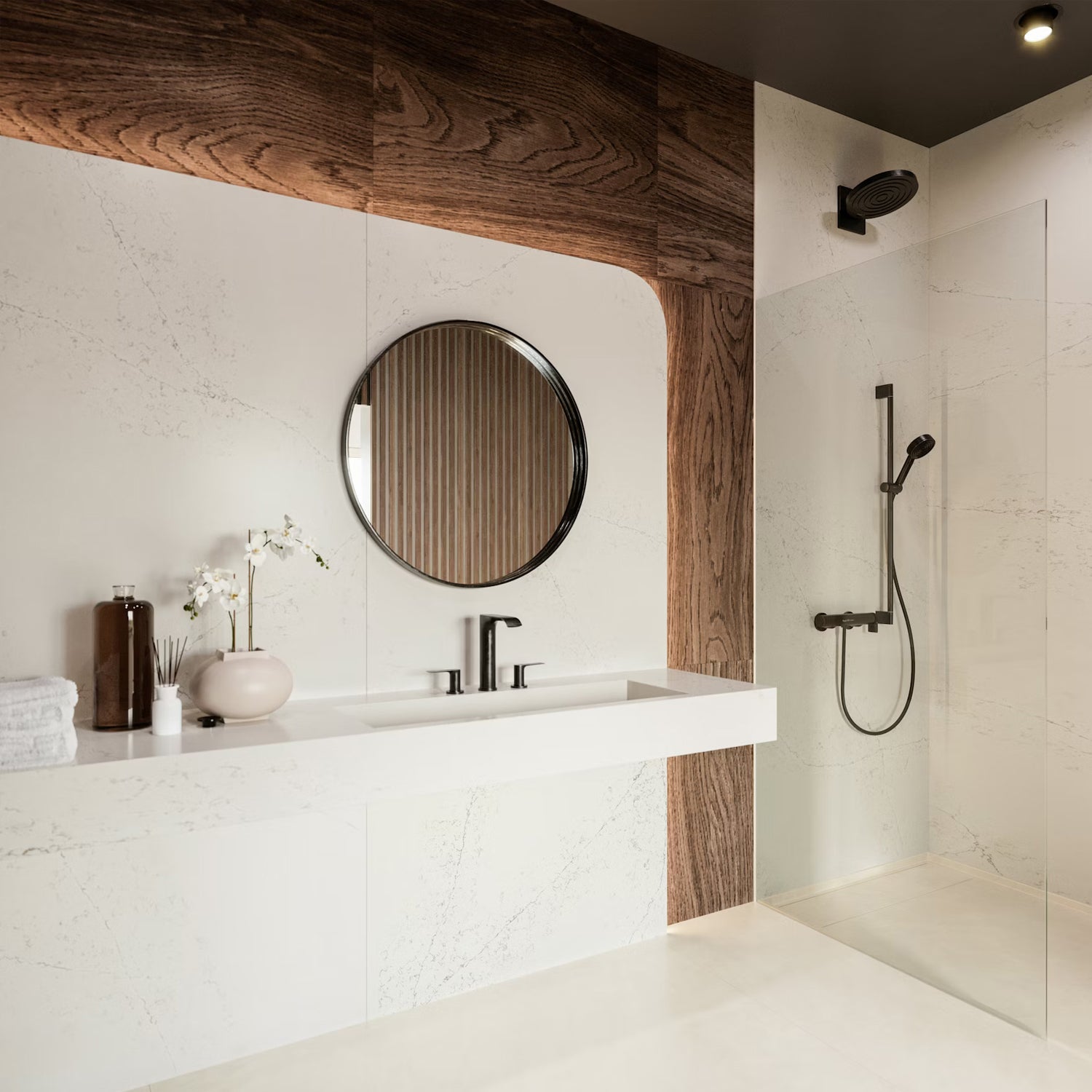 This color reinterprets the classic Calacatta marble, bringing subtlety and elegance through a pattern of warm veins intertwined with grey veins.