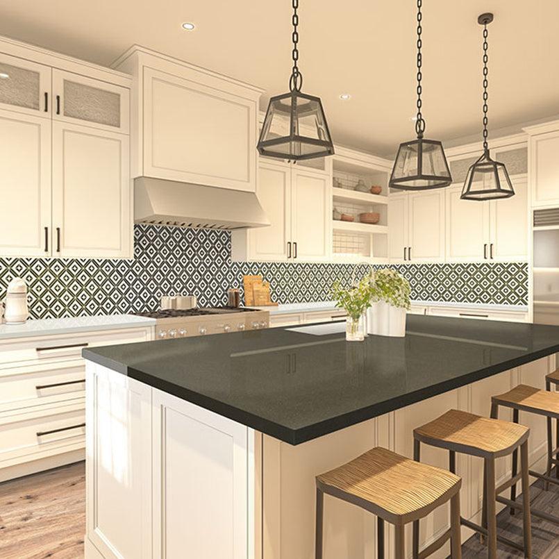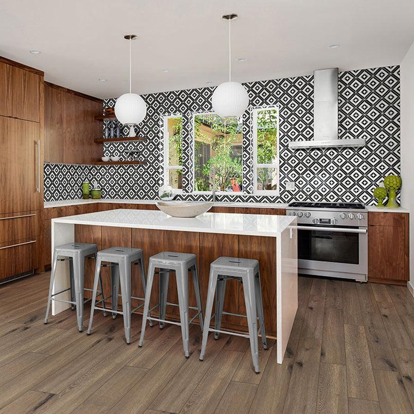Rhombix Nero Geometric Tile is modern geometric tile in diamond shapes made of alternating black and white marble with a polished finish. The modern design of this backsplash tile can be used for countertops, geometric floor tiles, and patterned wall tiles.