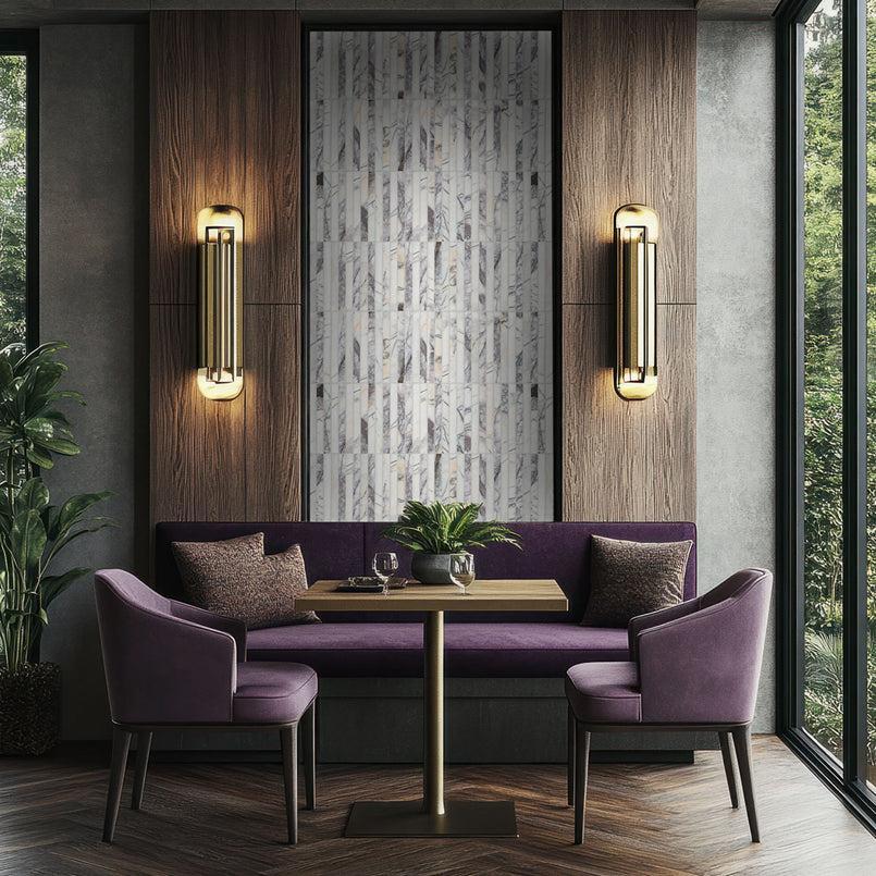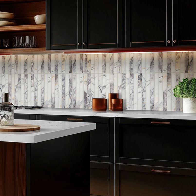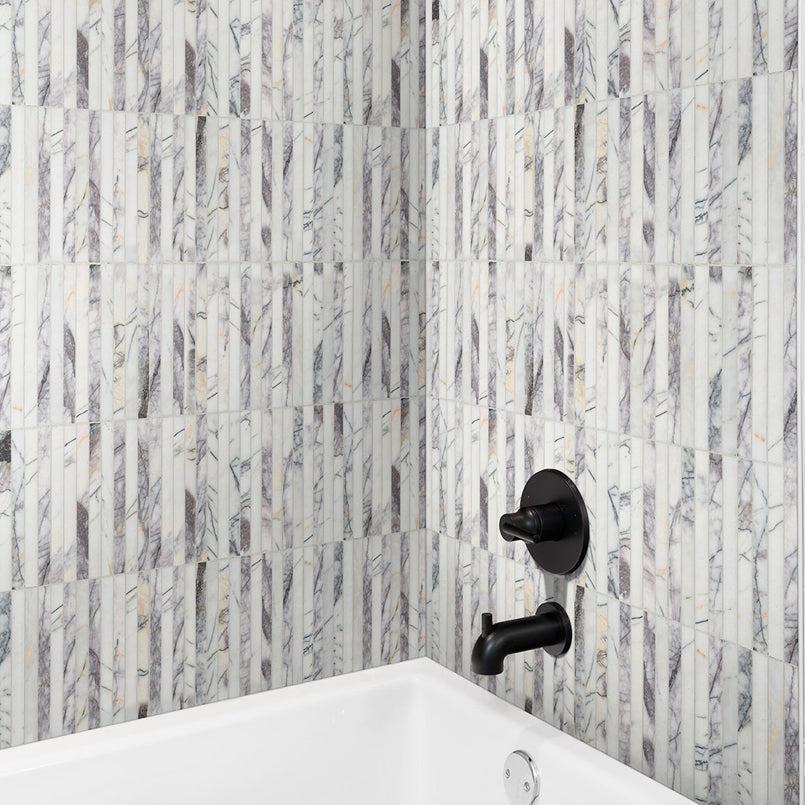 Scollopini Lilac Pattern Mosaic Tile features cool white marble with striking charcoal veins and a unique concave pattern that adds a dynamic touch to any space. The honed finish enhances its sleek elegance, while the mesh backing ensures easy installation. Perfect for stylish accent walls and backsplashes, this versatile tile brings a modern, luxurious feel to any room with its distinctive design and timeless appeal.