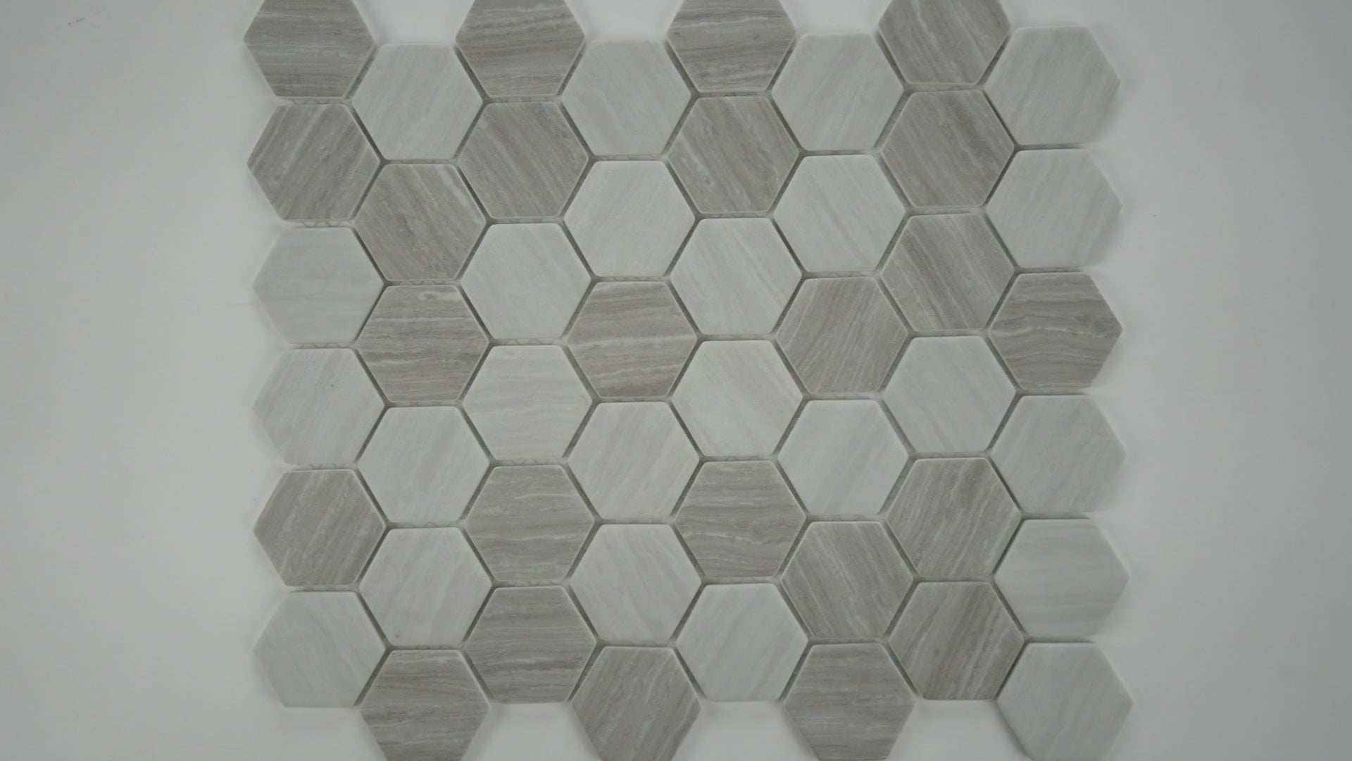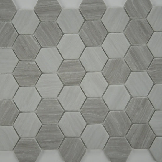 Silva Oak 2” Hexagon Mosaic Tile is traditional in shape but modernized in its trendy blend of grays, ranging from rich to sun-bleached, blended in an interlocking mosaic that evokes the classic elegance of ancient mosaic tilework. This 6mm thick modern glass hexagon tile is easy to care for, stain resistant, and durable, and is suited for use as an accent wall or backsplash tile, countertop surface, or even as a flooring tile in residential applications.