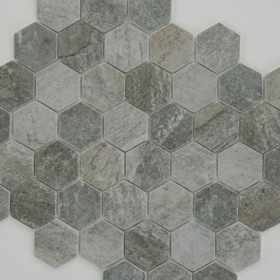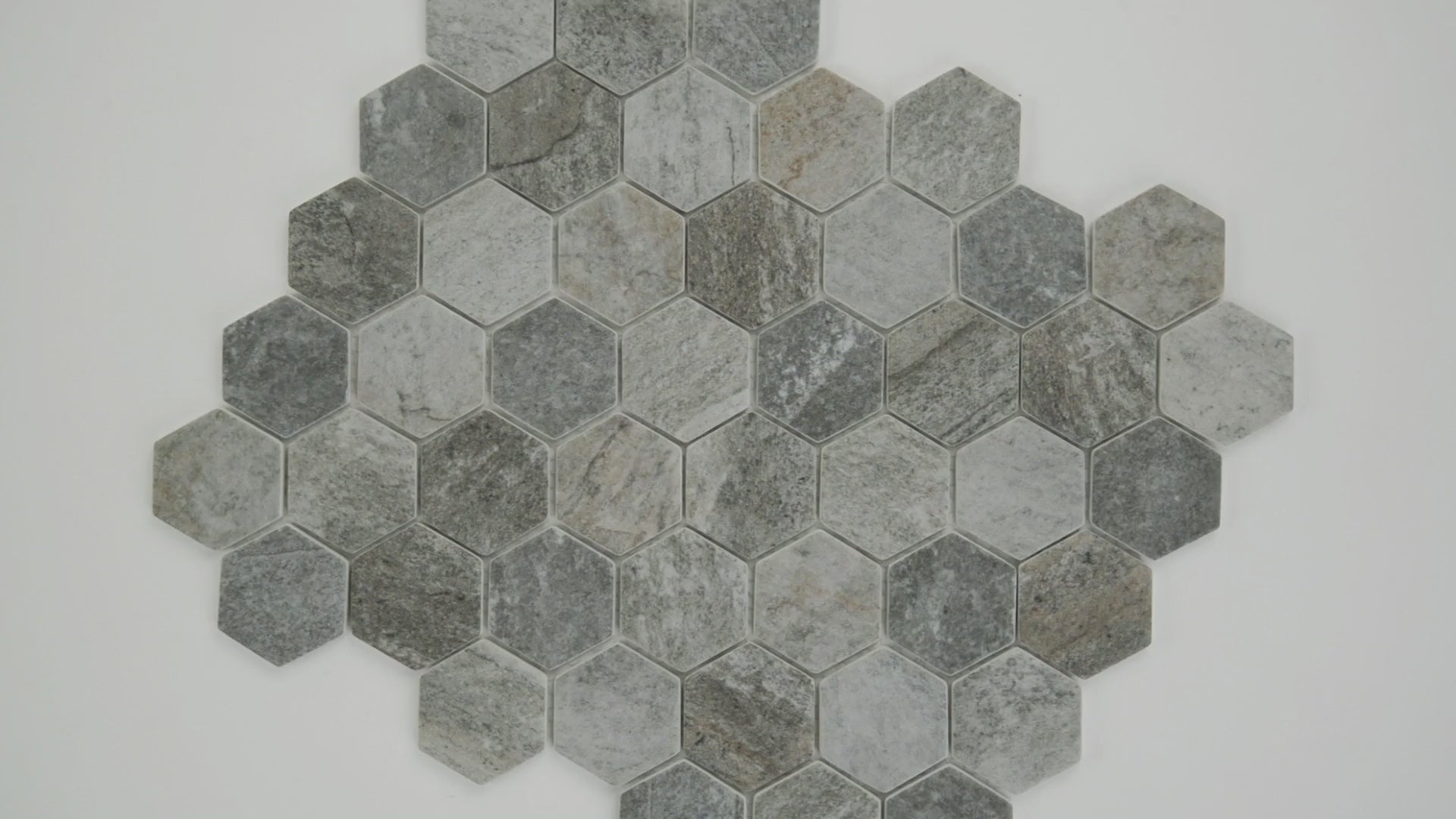 A moody-hued geometric recycled mosaic tile with gray and greige tones ranging from stormy blue to sun-bleached gray, Stonella Hexagon Mosaic Tile evokes the look of natural stone in a traditional mosaic. Modern glass tile is easy to care for, stain resistant, and durable. This tile is appropriate for use as a striking contemporary accent wall tile, countertop accent in tile, or even flooring material in residential applications.