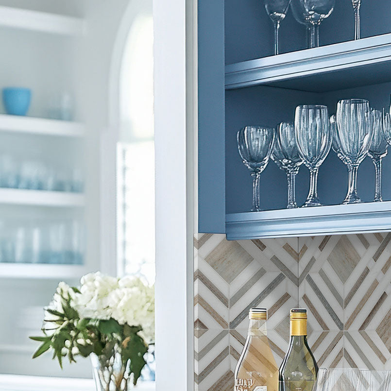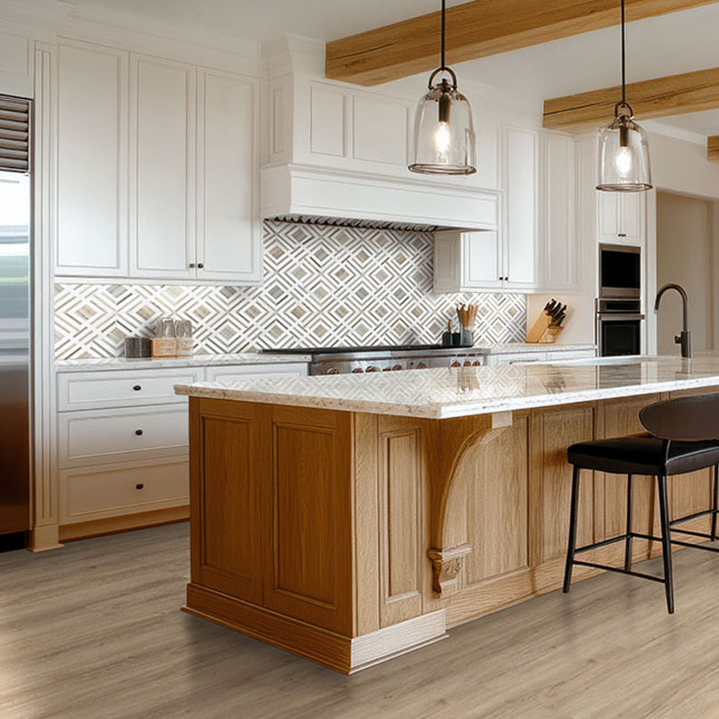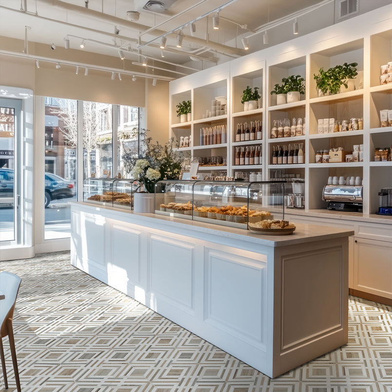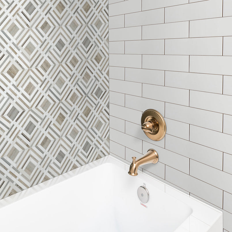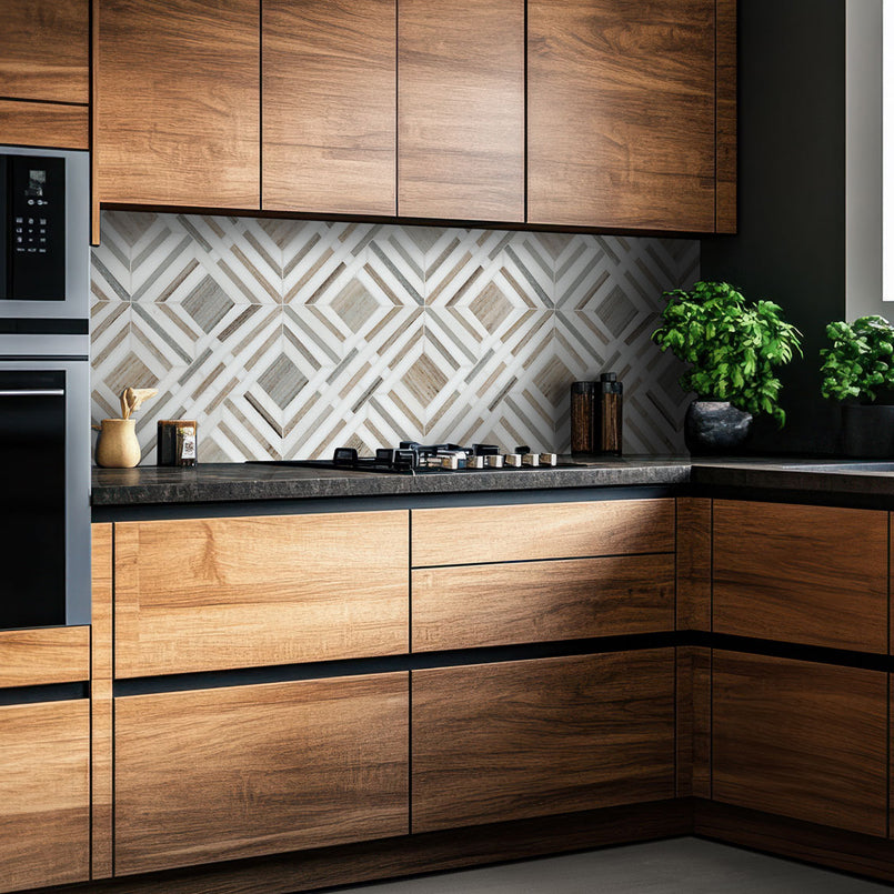 Wellington Pattern Mosaic Tile features warm white marble accented by elegant charcoal, beige, and taupe veins in a striking geometric pattern. The polished finish adds a sleek, refined look, while the mesh backing ensures easy installation. Ideal for stylish accent walls, backsplashes, and residential floors, this versatile tile offers a sophisticated blend of modern design and natural beauty, perfect for enhancing any interior space.