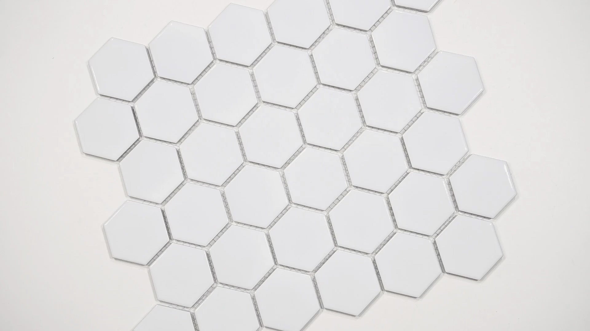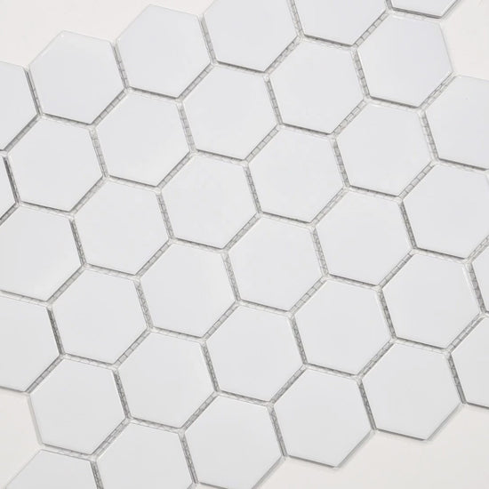 White Glossy 2” Hexagon Mosaic Tile is the perfect design addition to any project where a graphic pattern is desired. The tiles with a glossy finish and bright white color are recommended as backsplash tile, floor tile, and countertop tile. If you want a subtle backdrop, then select a grout that's similar in tone and color, but for a more dramatic and eye-catching installation, select a contrasting grout that will highlight the pattern. They also coordinate beautifully with a wide range of other ceramic wall tile options like subway tile and arabesque tile patterns in our extensive inventory.
